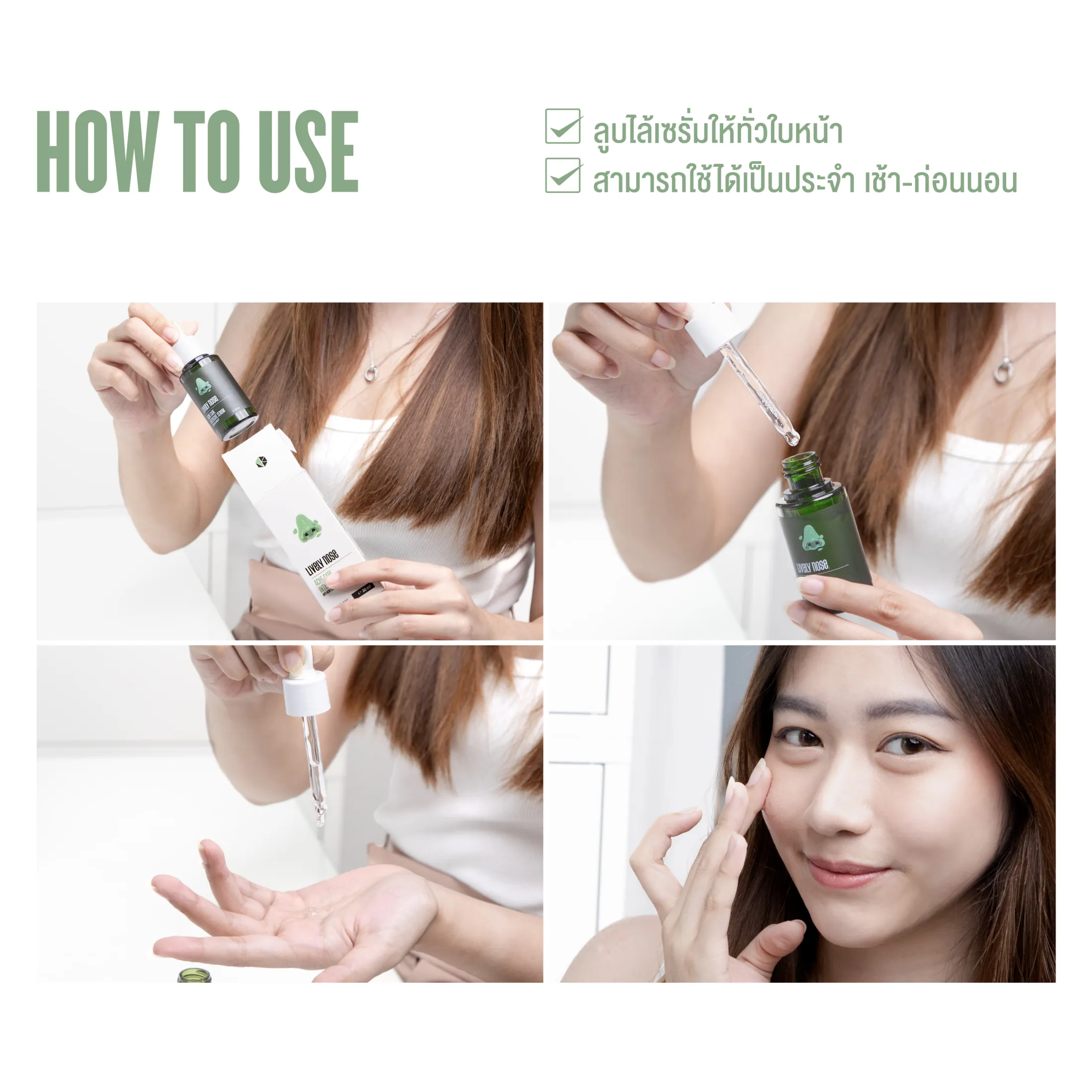 ลูบไล้เซรั่มให้ทั่วใบหน้า สามารถใช้ได้เป็นประจำทุกวัน เช้าก่อนนอน