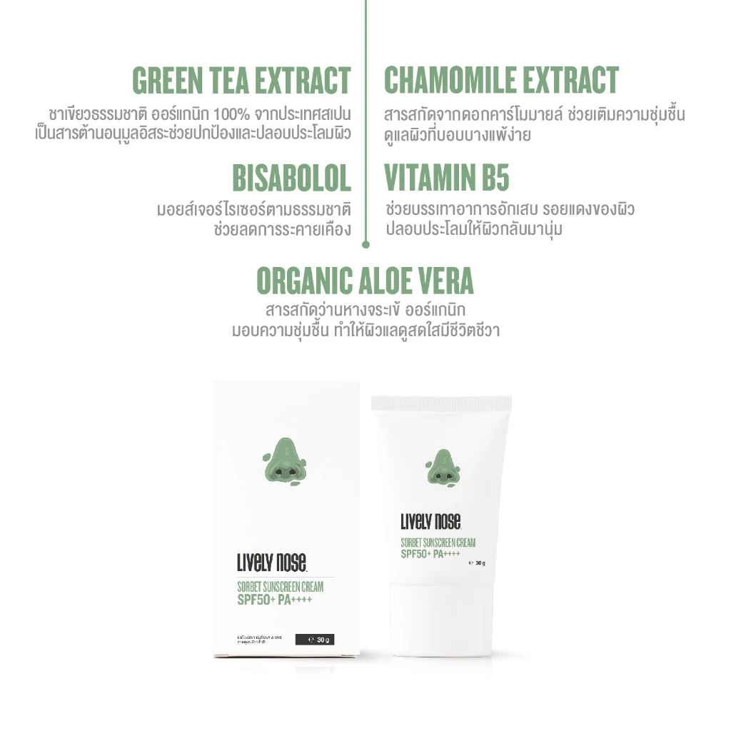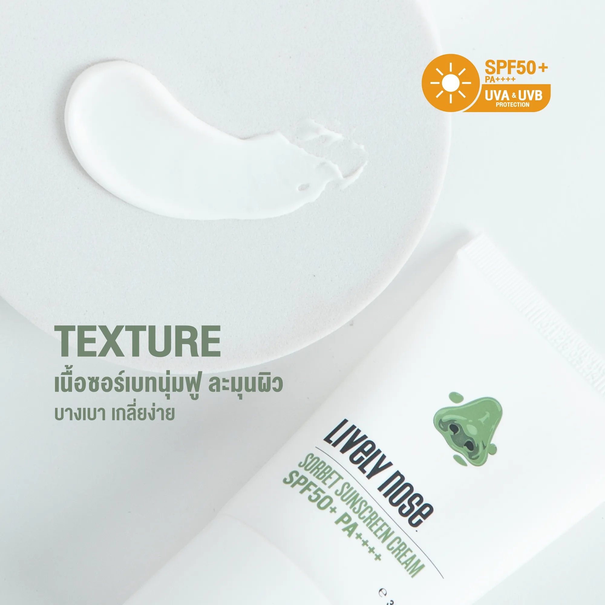 ผลิตภัณฑ์กันแดด เนื้อซอร์เบท สำหรับผิวหน้า ให้เนื้อสัมผัสนุ่มฟู ละมุนผิว บางเบา ไม่เหนียวเหนอะหนะ เนื้อมูสครีมซึบซาบไว ไม่ทิ้งความเยิ้มมันไว้บนผิวหน้าพร้อมการปกป้องผิวจากแสงแดดได้อย่างมีประสิทธิภาพ โดยปกป้องผิวจากรังสี UVA & UVB ที่เป็นสาเหตุของผิวคล้ำเสีย พร้อมผสานคุณค่าจากสารสหัดธรรมชาติ พร้อมฝื้นบำรุงปลอบประโลมผิวจากการถูกทำร้ายจากแสงแดด ให้ความรู้สึกมั่นใจได้ตลอดวัน